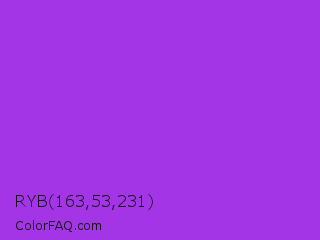 RYB 163,53,231 Color is a normal purple color and the nearest color is Veronica #a020f0. Hex code #a335e7 and RGB value is rgb(163,53,231). In RGB color space, this color is composed of 64% red, 21% green, 91% blue, In CMYK color space, this color is composed of 29% cyan, 77% magenta, 0% yellow , 9% black , In HSL color space, this color has a hue angle of 277° , 79% saturation and 56% lightness.