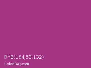 RYB 164,53,132 Color is a normal magenta color and the nearest color is Maximum Red Purple #a63a79. Hex code #a43584 and RGB value is rgb(164,53,132). In RGB color space, this color is composed of 64% red, 21% green, 52% blue, In CMYK color space, this color is composed of 0% cyan, 68% magenta, 20% yellow , 36% black , In HSL color space, this color has a hue angle of 317° , 51% saturation and 43% lightness.