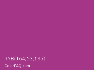 RYB 164,53,135 Color is a normal magenta color and the nearest color is Maximum Red Purple #a63a79. Hex code #a43587 and RGB value is rgb(164,53,135). In RGB color space, this color is composed of 64% red, 21% green, 53% blue, In CMYK color space, this color is composed of 0% cyan, 68% magenta, 18% yellow , 36% black , In HSL color space, this color has a hue angle of 316° , 51% saturation and 43% lightness.