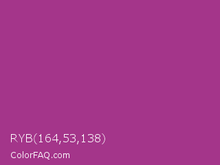 RYB 164,53,138 Color is a normal magenta color and the nearest color is Fandango #b53389. Hex code #a4358a and RGB value is rgb(164,53,138). In RGB color space, this color is composed of 64% red, 21% green, 54% blue, In CMYK color space, this color is composed of 0% cyan, 68% magenta, 16% yellow , 36% black , In HSL color space, this color has a hue angle of 314° , 51% saturation and 43% lightness.