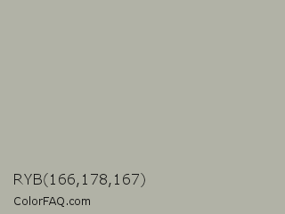 RYB 166,178,167 Color is a light yellow color and the nearest color is Eagle #b6baa4. Hex code #b1b2a6 and RGB value is rgb(177,178,166). In RGB color space, this color is composed of 69% red, 70% green, 65% blue, In CMYK color space, this color is composed of 1% cyan, 0% magenta, 7% yellow , 30% black , In HSL color space, this color has a hue angle of 65° , 7% saturation and 67% lightness.