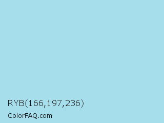 RYB 166,197,236 Color is a light cyan color and the nearest color is Non Photo Blue #a4dded. Hex code #a6deec and RGB value is rgb(166,222,236). In RGB color space, this color is composed of 65% red, 87% green, 93% blue, In CMYK color space, this color is composed of 30% cyan, 6% magenta, 0% yellow , 7% black , In HSL color space, this color has a hue angle of 192° , 65% saturation and 79% lightness.
