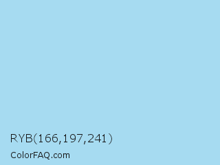 RYB 166,197,241 Color is a light blue color and the nearest color is Non Photo Blue #a4dded. Hex code #a6dbf1 and RGB value is rgb(166,219,241). In RGB color space, this color is composed of 65% red, 86% green, 95% blue, In CMYK color space, this color is composed of 31% cyan, 9% magenta, 0% yellow , 5% black , In HSL color space, this color has a hue angle of 198° , 73% saturation and 80% lightness.