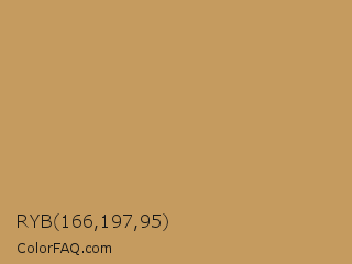 RYB 166,197,95 Color is a normal orange color and the nearest color is Twine #c2955d. Hex code #c59b5f and RGB value is rgb(197,155,95). In RGB color space, this color is composed of 77% red, 61% green, 37% blue, In CMYK color space, this color is composed of 0% cyan, 21% magenta, 52% yellow , 23% black , In HSL color space, this color has a hue angle of 35° , 47% saturation and 57% lightness.