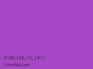 RYB 166,71,197 Color is a normal purple color and the nearest color is Purple Plum #9c51b6. Hex code #a647c5 and RGB value is rgb(166,71,197). In RGB color space, this color is composed of 65% red, 28% green, 77% blue, In CMYK color space, this color is composed of 16% cyan, 64% magenta, 0% yellow , 23% black , In HSL color space, this color has a hue angle of 285° , 52% saturation and 53% lightness.