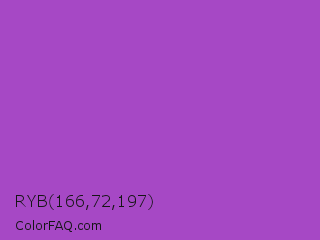 RYB 166,72,197 Color is a normal purple color and the nearest color is Purple Plum #9c51b6. Hex code #a648c5 and RGB value is rgb(166,72,197). In RGB color space, this color is composed of 65% red, 28% green, 77% blue, In CMYK color space, this color is composed of 16% cyan, 63% magenta, 0% yellow , 23% black , In HSL color space, this color has a hue angle of 285° , 52% saturation and 53% lightness.