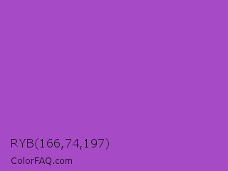 RYB 166,74,197 Color is a normal purple color and the nearest color is Purple Plum #9c51b6. Hex code #a64ac5 and RGB value is rgb(166,74,197). In RGB color space, this color is composed of 65% red, 29% green, 77% blue, In CMYK color space, this color is composed of 16% cyan, 62% magenta, 0% yellow , 23% black , In HSL color space, this color has a hue angle of 285° , 51% saturation and 53% lightness.