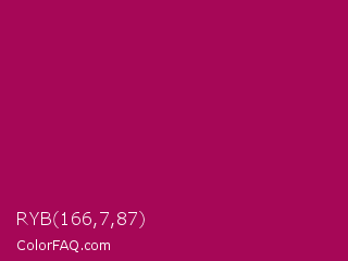 RYB 166,7,87 Color is a normal rose color and the nearest color is Jazzberry Jam #a50b5e. Hex code #a60757 and RGB value is rgb(166,7,87). In RGB color space, this color is composed of 65% red, 3% green, 34% blue, In CMYK color space, this color is composed of 0% cyan, 96% magenta, 48% yellow , 35% black , In HSL color space, this color has a hue angle of 330° , 92% saturation and 34% lightness.