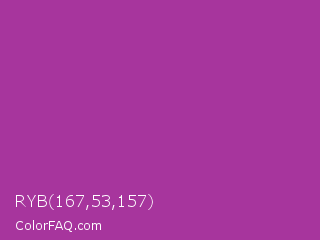 RYB 167,53,157 Color is a normal magenta color and the nearest color is Byzantine #bd33a4. Hex code #a7359d and RGB value is rgb(167,53,157). In RGB color space, this color is composed of 65% red, 21% green, 62% blue, In CMYK color space, this color is composed of 0% cyan, 68% magenta, 6% yellow , 35% black , In HSL color space, this color has a hue angle of 305° , 52% saturation and 43% lightness.