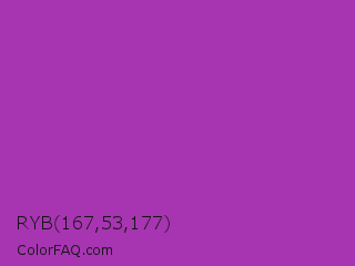 RYB 167,53,177 Color is a normal magenta color and the nearest color is Byzantine #bd33a4. Hex code #a735b1 and RGB value is rgb(167,53,177). In RGB color space, this color is composed of 65% red, 21% green, 69% blue, In CMYK color space, this color is composed of 6% cyan, 70% magenta, 0% yellow , 31% black , In HSL color space, this color has a hue angle of 295° , 54% saturation and 45% lightness.