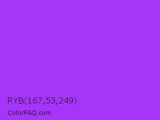 RYB 167,53,249 Color is a normal purple color and the nearest color is Veronica #a020f0. Hex code #a735f9 and RGB value is rgb(167,53,249). In RGB color space, this color is composed of 65% red, 21% green, 98% blue, In CMYK color space, this color is composed of 33% cyan, 79% magenta, 0% yellow , 2% black , In HSL color space, this color has a hue angle of 275° , 94% saturation and 59% lightness.
