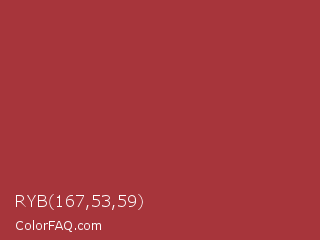 RYB 167,53,59 Color is a normal red color and the nearest color is Sweet Brown #a83731. Hex code #a7353b and RGB value is rgb(167,53,59). In RGB color space, this color is composed of 65% red, 21% green, 23% blue, In CMYK color space, this color is composed of 0% cyan, 68% magenta, 65% yellow , 35% black , In HSL color space, this color has a hue angle of 357° , 52% saturation and 43% lightness.