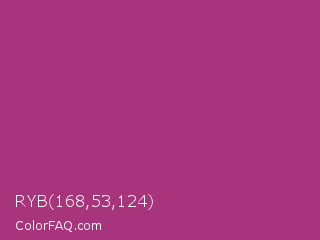 RYB 168,53,124 Color is a normal magenta color and the nearest color is Maximum Red Purple #a63a79. Hex code #a8357c and RGB value is rgb(168,53,124). In RGB color space, this color is composed of 66% red, 21% green, 49% blue, In CMYK color space, this color is composed of 0% cyan, 68% magenta, 26% yellow , 34% black , In HSL color space, this color has a hue angle of 323° , 52% saturation and 43% lightness.