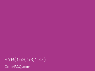 RYB 168,53,137 Color is a normal magenta color and the nearest color is Fandango #b53389. Hex code #a83589 and RGB value is rgb(168,53,137). In RGB color space, this color is composed of 66% red, 21% green, 54% blue, In CMYK color space, this color is composed of 0% cyan, 68% magenta, 18% yellow , 34% black , In HSL color space, this color has a hue angle of 316° , 52% saturation and 43% lightness.