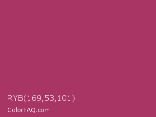 RYB 169,53,101 Color is a normal rose color and the nearest color is Rich Maroon #b03060. Hex code #a93565 and RGB value is rgb(169,53,101). In RGB color space, this color is composed of 66% red, 21% green, 40% blue, In CMYK color space, this color is composed of 0% cyan, 69% magenta, 40% yellow , 34% black , In HSL color space, this color has a hue angle of 335° , 52% saturation and 44% lightness.