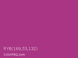 RYB 169,53,132 Color is a normal magenta color and the nearest color is Maximum Red Purple #a63a79. Hex code #a93584 and RGB value is rgb(169,53,132). In RGB color space, this color is composed of 66% red, 21% green, 52% blue, In CMYK color space, this color is composed of 0% cyan, 69% magenta, 22% yellow , 34% black , In HSL color space, this color has a hue angle of 319° , 52% saturation and 44% lightness.