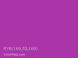 RYB 169,53,169 Color is a normal magenta color and the nearest color is Byzantine #bd33a4. Hex code #a935a9 and RGB value is rgb(169,53,169). In RGB color space, this color is composed of 66% red, 21% green, 66% blue, In CMYK color space, this color is composed of 0% cyan, 69% magenta, 0% yellow , 34% black , In HSL color space, this color has a hue angle of 300° , 52% saturation and 44% lightness.