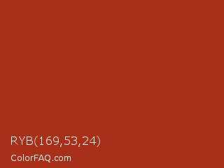 RYB 169,53,24 Color is a normal red color and the nearest color is Roof Terracotta #a62f20. Hex code #a93018 and RGB value is rgb(169,48,24). In RGB color space, this color is composed of 66% red, 19% green, 9% blue, In CMYK color space, this color is composed of 0% cyan, 72% magenta, 86% yellow , 34% black , In HSL color space, this color has a hue angle of 10° , 75% saturation and 38% lightness.