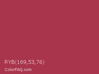 RYB 169,53,76 Color is a normal red color and the nearest color is Night Shadz #aa375a. Hex code #a9354c and RGB value is rgb(169,53,76). In RGB color space, this color is composed of 66% red, 21% green, 30% blue, In CMYK color space, this color is composed of 0% cyan, 69% magenta, 55% yellow , 34% black , In HSL color space, this color has a hue angle of 348° , 52% saturation and 44% lightness.