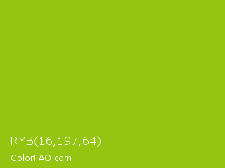 RYB 16,197,64 Color is a normal lime color and the nearest color is Pistachio Green #9dc209. Hex code #95c510 and RGB value is rgb(149,197,16). In RGB color space, this color is composed of 58% red, 77% green, 6% blue, In CMYK color space, this color is composed of 24% cyan, 0% magenta, 92% yellow , 23% black , In HSL color space, this color has a hue angle of 76° , 85% saturation and 42% lightness.