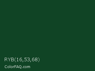 RYB 16,53,68 Color is a very dark green color and the nearest color is Zuccini #044022. Hex code #104425 and RGB value is rgb(16,68,37). In RGB color space, this color is composed of 6% red, 27% green, 15% blue, In CMYK color space, this color is composed of 76% cyan, 0% magenta, 46% yellow , 73% black , In HSL color space, this color has a hue angle of 144° , 62% saturation and 16% lightness.
