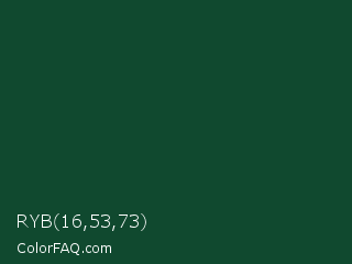 RYB 16,53,73 Color is a very dark green color and the nearest color is MSU Green #18453b. Hex code #10492f and RGB value is rgb(16,73,47). In RGB color space, this color is composed of 6% red, 29% green, 18% blue, In CMYK color space, this color is composed of 78% cyan, 0% magenta, 36% yellow , 71% black , In HSL color space, this color has a hue angle of 153° , 64% saturation and 17% lightness.
