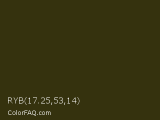 RYB 17.25,53,14 Color is a very dark yellow color and the nearest color is Brown Tumbleweed #37290e. Hex code #35320e and RGB value is rgb(53,50,14). In RGB color space, this color is composed of 21% red, 20% green, 5% blue, In CMYK color space, this color is composed of 0% cyan, 6% magenta, 74% yellow , 79% black , In HSL color space, this color has a hue angle of 55° , 58% saturation and 13% lightness.