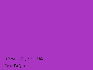 RYB 170,53,194 Color is a normal purple color and the nearest color is Dark Orchid #9932cc. Hex code #aa35c2 and RGB value is rgb(170,53,194). In RGB color space, this color is composed of 67% red, 21% green, 76% blue, In CMYK color space, this color is composed of 12% cyan, 73% magenta, 0% yellow , 24% black , In HSL color space, this color has a hue angle of 290° , 57% saturation and 48% lightness.