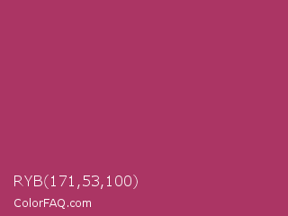 RYB 171,53,100 Color is a normal rose color and the nearest color is Rich Maroon #b03060. Hex code #ab3564 and RGB value is rgb(171,53,100). In RGB color space, this color is composed of 67% red, 21% green, 39% blue, In CMYK color space, this color is composed of 0% cyan, 69% magenta, 42% yellow , 33% black , In HSL color space, this color has a hue angle of 336° , 53% saturation and 44% lightness.