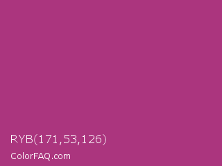 RYB 171,53,126 Color is a normal magenta color and the nearest color is Maximum Red Purple #a63a79. Hex code #ab357e and RGB value is rgb(171,53,126). In RGB color space, this color is composed of 67% red, 21% green, 49% blue, In CMYK color space, this color is composed of 0% cyan, 69% magenta, 26% yellow , 33% black , In HSL color space, this color has a hue angle of 323° , 53% saturation and 44% lightness.