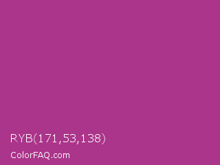RYB 171,53,138 Color is a normal magenta color and the nearest color is Fandango #b53389. Hex code #ab358a and RGB value is rgb(171,53,138). In RGB color space, this color is composed of 67% red, 21% green, 54% blue, In CMYK color space, this color is composed of 0% cyan, 69% magenta, 19% yellow , 33% black , In HSL color space, this color has a hue angle of 317° , 53% saturation and 44% lightness.