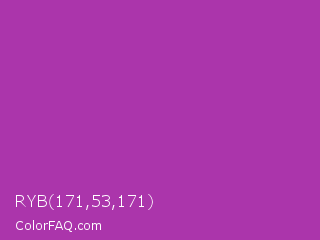 RYB 171,53,171 Color is a normal magenta color and the nearest color is Byzantine #bd33a4. Hex code #ab35ab and RGB value is rgb(171,53,171). In RGB color space, this color is composed of 67% red, 21% green, 67% blue, In CMYK color space, this color is composed of 0% cyan, 69% magenta, 0% yellow , 33% black , In HSL color space, this color has a hue angle of 300° , 53% saturation and 44% lightness.
