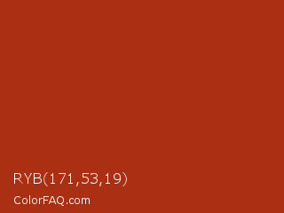 RYB 171,53,19 Color is a normal red color and the nearest color is Tabasco #a02712. Hex code #ab2f13 and RGB value is rgb(171,47,19). In RGB color space, this color is composed of 67% red, 18% green, 7% blue, In CMYK color space, this color is composed of 0% cyan, 73% magenta, 89% yellow , 33% black , In HSL color space, this color has a hue angle of 11° , 80% saturation and 37% lightness.