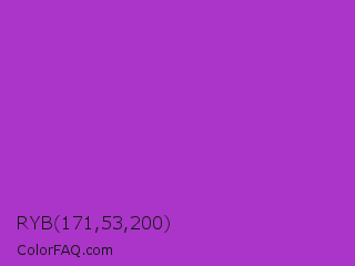 RYB 171,53,200 Color is a normal purple color and the nearest color is Dark Orchid #9932cc. Hex code #ab35c8 and RGB value is rgb(171,53,200). In RGB color space, this color is composed of 67% red, 21% green, 78% blue, In CMYK color space, this color is composed of 15% cyan, 74% magenta, 0% yellow , 22% black , In HSL color space, this color has a hue angle of 288° , 58% saturation and 50% lightness.