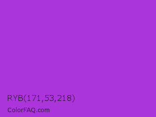 RYB 171,53,218 Color is a normal purple color and the nearest color is Dark Orchid #9932cc. Hex code #ab35da and RGB value is rgb(171,53,218). In RGB color space, this color is composed of 67% red, 21% green, 85% blue, In CMYK color space, this color is composed of 22% cyan, 76% magenta, 0% yellow , 15% black , In HSL color space, this color has a hue angle of 283° , 69% saturation and 53% lightness.
