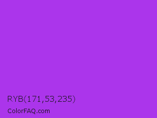 RYB 171,53,235 Color is a normal purple color and the nearest color is Veronica #a020f0. Hex code #ab35eb and RGB value is rgb(171,53,235). In RGB color space, this color is composed of 67% red, 21% green, 92% blue, In CMYK color space, this color is composed of 27% cyan, 77% magenta, 0% yellow , 8% black , In HSL color space, this color has a hue angle of 279° , 82% saturation and 56% lightness.