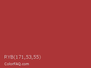 RYB 171,53,55 Color is a normal red color and the nearest color is Sweet Brown #a83731. Hex code #ab3537 and RGB value is rgb(171,53,55). In RGB color space, this color is composed of 67% red, 21% green, 22% blue, In CMYK color space, this color is composed of 0% cyan, 69% magenta, 68% yellow , 33% black , In HSL color space, this color has a hue angle of 359° , 53% saturation and 44% lightness.