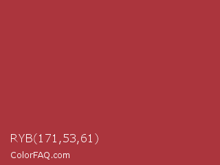 RYB 171,53,61 Color is a normal red color and the nearest color is Sweet Brown #a83731. Hex code #ab353d and RGB value is rgb(171,53,61). In RGB color space, this color is composed of 67% red, 21% green, 24% blue, In CMYK color space, this color is composed of 0% cyan, 69% magenta, 64% yellow , 33% black , In HSL color space, this color has a hue angle of 356° , 53% saturation and 44% lightness.