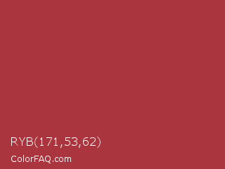 RYB 171,53,62 Color is a normal red color and the nearest color is Sweet Brown #a83731. Hex code #ab353e and RGB value is rgb(171,53,62). In RGB color space, this color is composed of 67% red, 21% green, 24% blue, In CMYK color space, this color is composed of 0% cyan, 69% magenta, 64% yellow , 33% black , In HSL color space, this color has a hue angle of 355° , 53% saturation and 44% lightness.