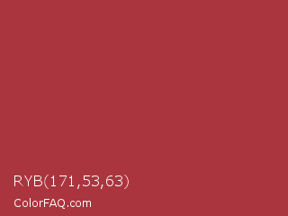 RYB 171,53,63 Color is a normal red color and the nearest color is Sweet Brown #a83731. Hex code #ab353f and RGB value is rgb(171,53,63). In RGB color space, this color is composed of 67% red, 21% green, 25% blue, In CMYK color space, this color is composed of 0% cyan, 69% magenta, 63% yellow , 33% black , In HSL color space, this color has a hue angle of 355° , 53% saturation and 44% lightness.