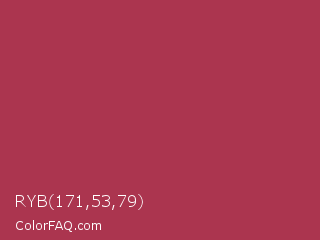 RYB 171,53,79 Color is a normal red color and the nearest color is Night Shadz #aa375a. Hex code #ab354f and RGB value is rgb(171,53,79). In RGB color space, this color is composed of 67% red, 21% green, 31% blue, In CMYK color space, this color is composed of 0% cyan, 69% magenta, 54% yellow , 33% black , In HSL color space, this color has a hue angle of 347° , 53% saturation and 44% lightness.