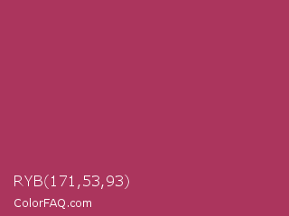 RYB 171,53,93 Color is a normal rose color and the nearest color is Night Shadz #aa375a. Hex code #ab355d and RGB value is rgb(171,53,93). In RGB color space, this color is composed of 67% red, 21% green, 36% blue, In CMYK color space, this color is composed of 0% cyan, 69% magenta, 46% yellow , 33% black , In HSL color space, this color has a hue angle of 340° , 53% saturation and 44% lightness.
