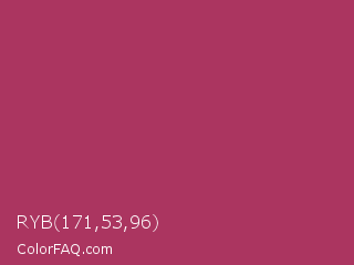 RYB 171,53,96 Color is a normal rose color and the nearest color is Night Shadz #aa375a. Hex code #ab3560 and RGB value is rgb(171,53,96). In RGB color space, this color is composed of 67% red, 21% green, 38% blue, In CMYK color space, this color is composed of 0% cyan, 69% magenta, 44% yellow , 33% black , In HSL color space, this color has a hue angle of 338° , 53% saturation and 44% lightness.