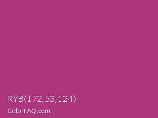 RYB 172,53,124 Color is a normal magenta color and the nearest color is Maximum Red Purple #a63a79. Hex code #ac357c and RGB value is rgb(172,53,124). In RGB color space, this color is composed of 67% red, 21% green, 49% blue, In CMYK color space, this color is composed of 0% cyan, 69% magenta, 28% yellow , 33% black , In HSL color space, this color has a hue angle of 324° , 53% saturation and 44% lightness.