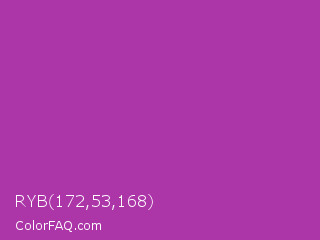 RYB 172,53,168 Color is a normal magenta color and the nearest color is Byzantine #bd33a4. Hex code #ac35a8 and RGB value is rgb(172,53,168). In RGB color space, this color is composed of 67% red, 21% green, 66% blue, In CMYK color space, this color is composed of 0% cyan, 69% magenta, 2% yellow , 33% black , In HSL color space, this color has a hue angle of 302° , 53% saturation and 44% lightness.
