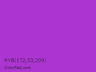 RYB 172,53,209 Color is a normal purple color and the nearest color is Dark Orchid #9932cc. Hex code #ac35d1 and RGB value is rgb(172,53,209). In RGB color space, this color is composed of 67% red, 21% green, 82% blue, In CMYK color space, this color is composed of 18% cyan, 75% magenta, 0% yellow , 18% black , In HSL color space, this color has a hue angle of 286° , 63% saturation and 51% lightness.