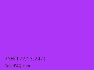 RYB 172,53,247 Color is a normal purple color and the nearest color is Veronica #a020f0. Hex code #ac35f7 and RGB value is rgb(172,53,247). In RGB color space, this color is composed of 67% red, 21% green, 97% blue, In CMYK color space, this color is composed of 30% cyan, 79% magenta, 0% yellow , 3% black , In HSL color space, this color has a hue angle of 277° , 92% saturation and 59% lightness.