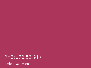 RYB 172,53,91 Color is a normal rose color and the nearest color is Night Shadz #aa375a. Hex code #ac355b and RGB value is rgb(172,53,91). In RGB color space, this color is composed of 67% red, 21% green, 36% blue, In CMYK color space, this color is composed of 0% cyan, 69% magenta, 47% yellow , 33% black , In HSL color space, this color has a hue angle of 341° , 53% saturation and 44% lightness.