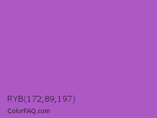 RYB 172,89,197 Color is a normal purple color and the nearest color is Medium Orchid #ba55d3. Hex code #ac59c5 and RGB value is rgb(172,89,197). In RGB color space, this color is composed of 67% red, 35% green, 77% blue, In CMYK color space, this color is composed of 13% cyan, 55% magenta, 0% yellow , 23% black , In HSL color space, this color has a hue angle of 286° , 48% saturation and 56% lightness.