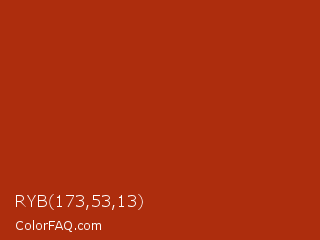 RYB 173,53,13 Color is a normal red color and the nearest color is Tabasco #a02712. Hex code #ad2d0d and RGB value is rgb(173,45,13). In RGB color space, this color is composed of 68% red, 18% green, 5% blue, In CMYK color space, this color is composed of 0% cyan, 74% magenta, 92% yellow , 32% black , In HSL color space, this color has a hue angle of 12° , 86% saturation and 36% lightness.